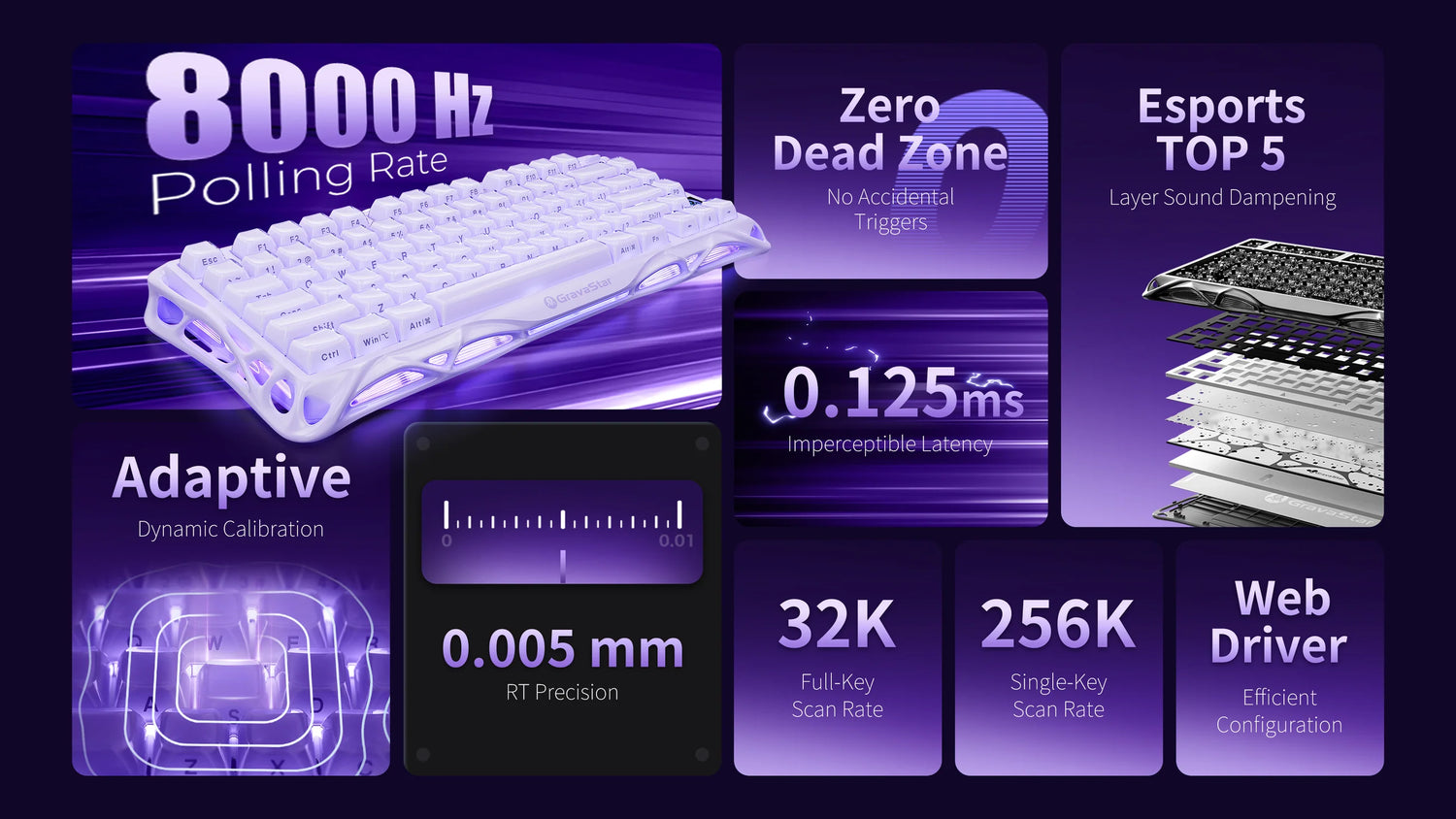 True 8kHz Polling Rate:Boasts an 8000Hz USB polling rate paired with 256kHz key-position scanning, reducing latency to a near-instantaneous 0.125ms.