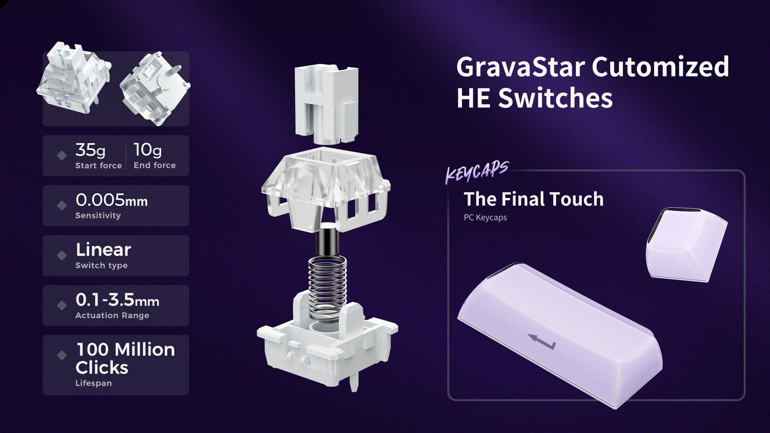 GravaStar x Gateron Magnetic Jade Pro Switch:Engineered for 0.005mm precision with adjustable trigger depth (0.1mm–3.5mm) to eliminate lag and enhance control.