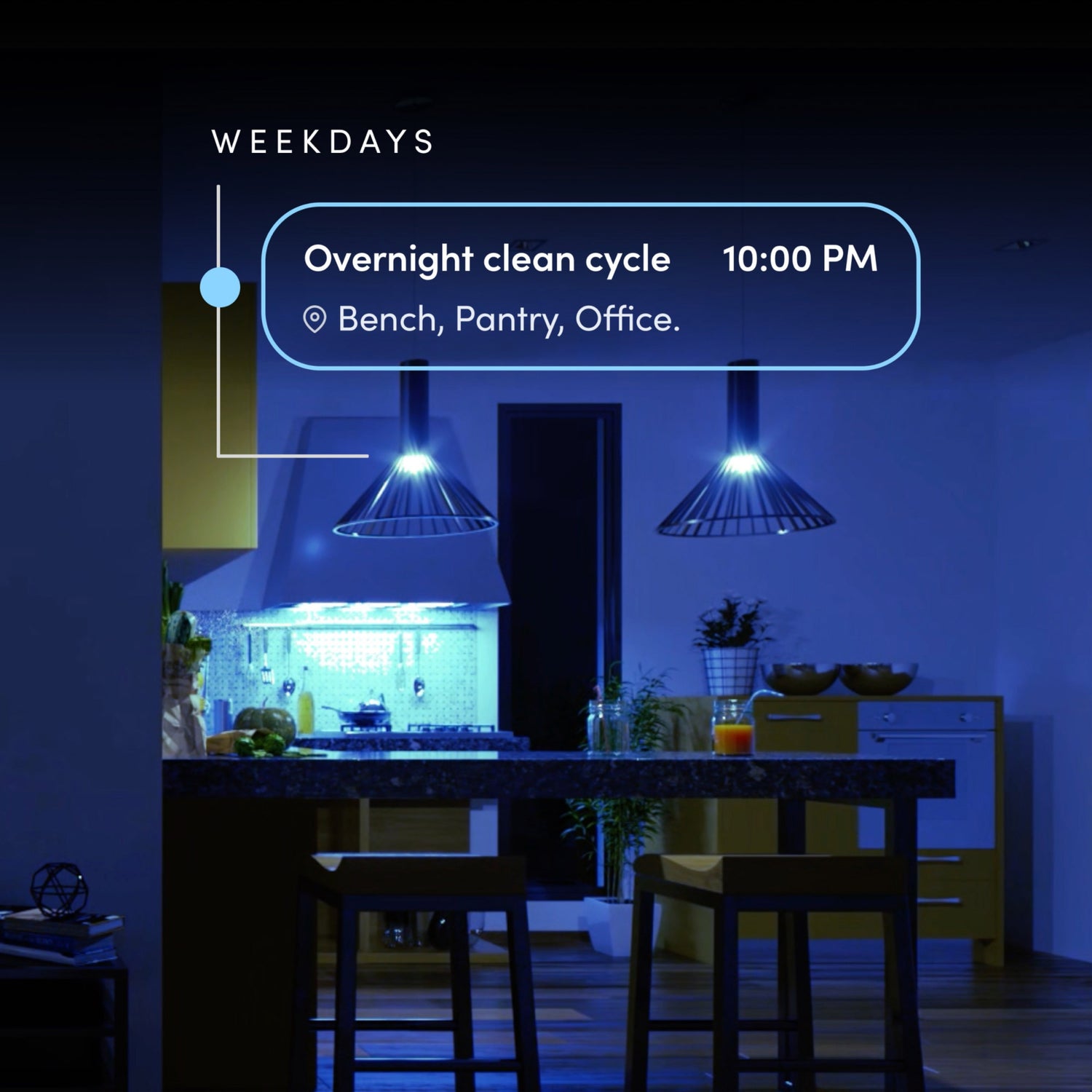 Schedule it to wake you softly in the morning, illuminate your work space throughout the afternoon, and then help you doze off before bed. At night, schedule LIFX Clean to turn on, eliminate bacteria* with HEV light, and then turn off when it’s complete. *LIFX Clean can help eliminate over 90% of S. aureus and E. coli on surfaces depending on the distance and time.