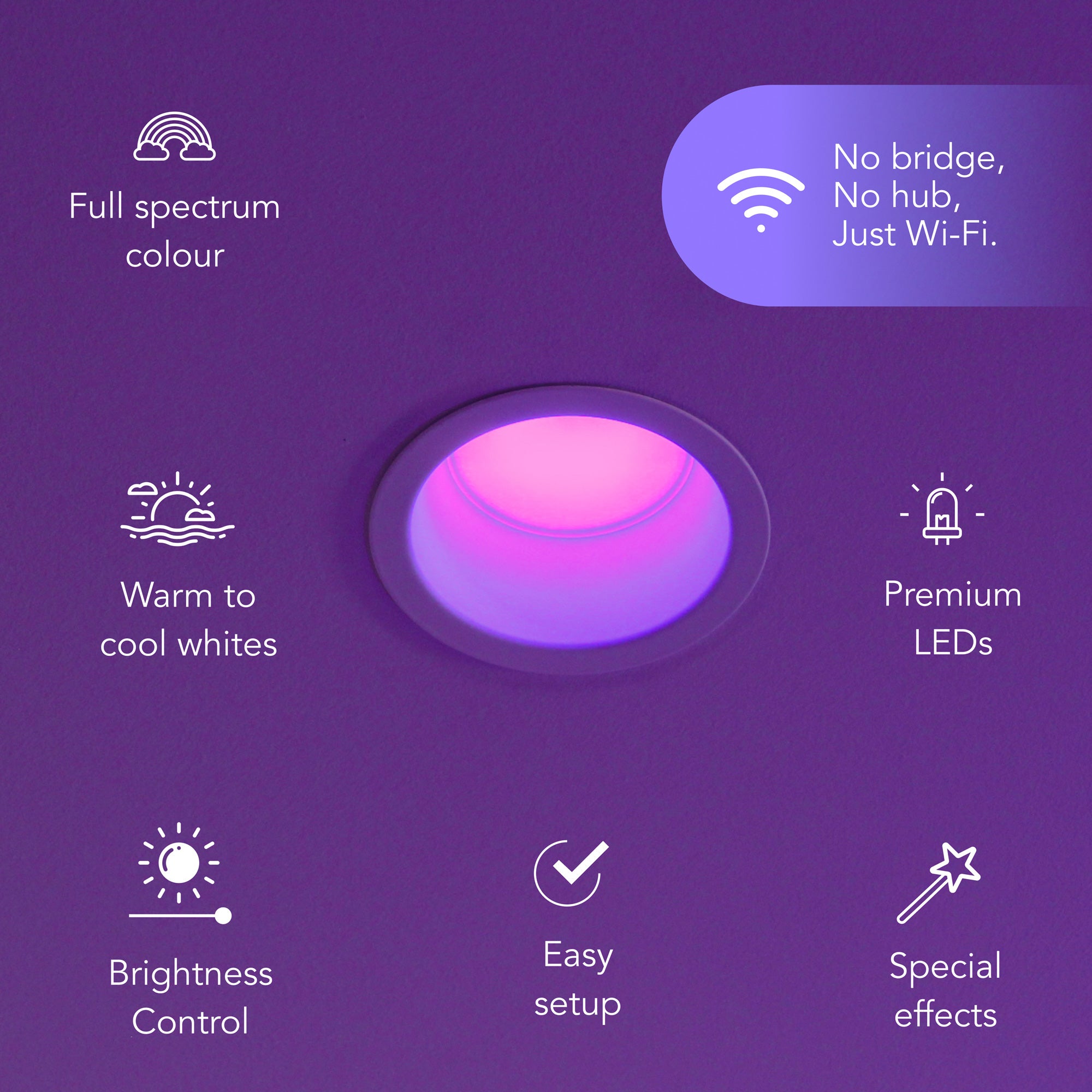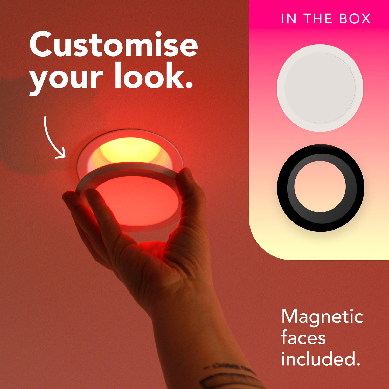 This LIFX SuperColour Recessed Downlight is about to redefine your idea of “mood lighting.” Just plug in and use bright whites to invigorate and illuminate your entire workspace. Flip to a bold blue to enhance your creative corner. Fade into lilac to transform your humble bathroom into a high end spa. Then dim to warm ambers to get ready for bed. And you can do it all with schedules, app control, or voice commands. Now that’s a smart light.Magnetic Faces:White and Black trims included. Optional flush diffuser. Swap your style and colour.